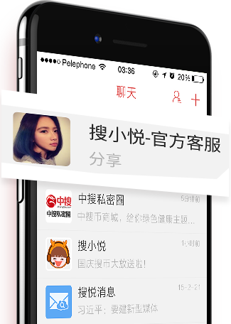 聊天中的服务号将为您推荐个性化的精品资讯,漂亮的搜小悦客服MM为你解答搜悦中的各种问题